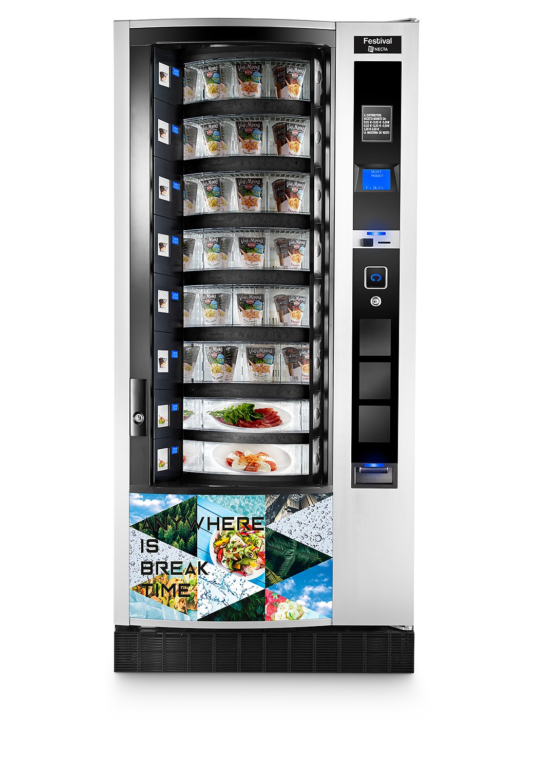 Fiesta de comida fresca Festival es la solución inteligente para lugares que necesitan ofrecer servicios de catering 24/7 . No solo una máquina expendedora sino una verdadera cantina automática. La extrema flexibilidad de configuración permite al usuario elegir entre bocadillos, bebidas, platos frescos, fruta y yogur. La electrónica mejorada del Festival ofrece una avanzada máquina y gestión de productos. Festival logra la calificación energética de A + (protocolo EVA EMP 3.0) gracias a las excelentes prestaciones en ahorro de energía.