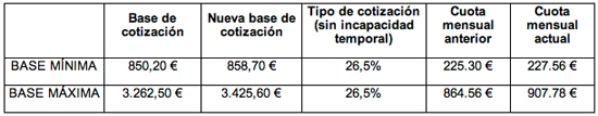 Los autónomos indican que el tope de máxima en las bases de cotización pasa de 3.262,5 a 3.425,6 euros mensuales (+5%). De igual manera, la base mínima de cotización sube un 1%; pasará de 850,2 euros mensuales a 858,7 euros. Es decir, un profesional por cuenta propia con un tipo de cotización sin incapacidad temporal (26.5%), pagará mensualmente a la Seguridad Social, como mínimo 227.56 euros, 2.26 euros más al mes, lo cual significa 27.12 euros más al año.