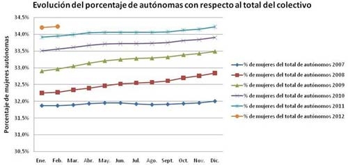 El total de mujeres registradas en el Régimen Especial de Trabajadores Autónomos (RETA) es de 1.042.528, el 34,23% del total de autónomos registrados en enero de 2012. Así, el peso de la mujer dentro del colectivo llega al porcentaje más alto alcanzado en los últimos cinco años, sin una sola pausa de crecimiento durante más de 60 meses. Ellas son quienes más han resistido la crisis económica durante estos últimos cinco años.