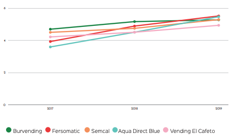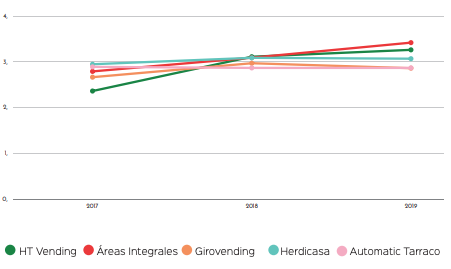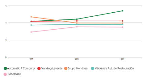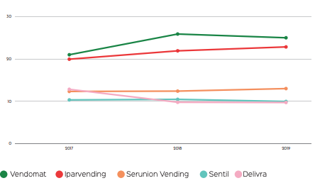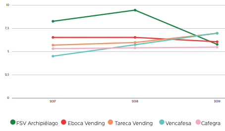 Grandes cambios en las posiciones medias: Llegamos a la parte media de la tabla donde el 2019 ha traido consigo un intercambio de posiciones: Tareca Vending se hace con el puesto 11º gracias a un aumento del 16%. FSV experimenta una caída de las ventas del 39%. Mientras, Vencafesa confirma su buena trayectoria con más de un millón de euros más en la facturación.